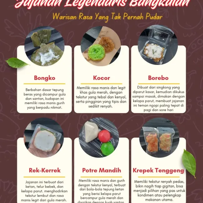 Bangkalan, salah satu kabupaten di Pulau Madura menyimpan beragam kekayaan kuliner tradisional yang menggugah selera. Jajanan-jajanan legendaris khas Bangkalan menjadi salah satu kekayaan budaya yang diwariskan turun temurun dan masih eksis hingga saat ini.
