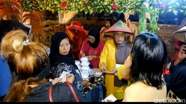 Di pasar jadul ini, pengunjung dapat menikmati berbagai kuliner khas Indonesia seperti ubi rebus, klepon, serabi, cenil, nagasari, hingga kue lumpur. Nuansa tempo dulu makin terasa karena setiap stan dibuat dari anyaman bambu beratap daun tebu kering.