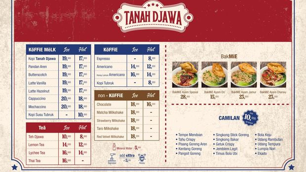 Selain itu, tersedia pula minuman segar dan jajanan tradisional yang membangkitkan nostalgia masa kecil. Harga makanan di Tanah Djawa juga ramah di kantong. Berikut beberapa harga menunya.