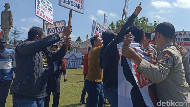 Unjuk rasa tersebut berlangsung ricuh, terjadi saling dorong antara pengunjuk rasa dengan personel polisi. Skenario itu dilanjutkan dengan proses pengamanan yang dilakukan personel kepolisian untuk memukul mundur demonstran dengan perlengkapan water cannon.