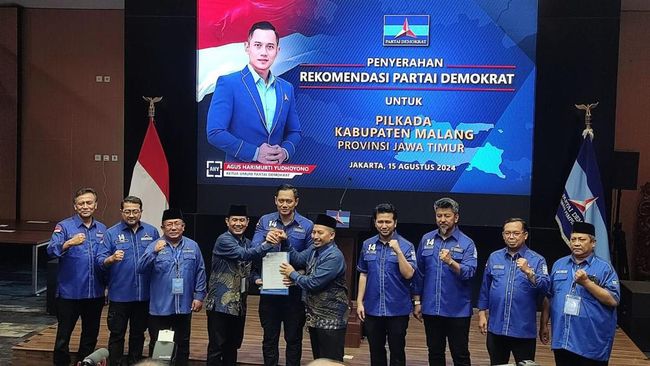 "Secara langsung Ketua Umum Partai Demokrat Agus Harimurti Yudhoyono (AHY) menyerahkan rekomendasi kepada Gunawan berpasangan dengan dr Umar Usman untuk maju di Pilkada Kabupaten Malang," ujar Hadi Mustofa kepada detikJatim, Senin (26/8/2024).