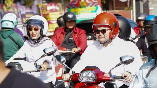 Uniknya, pasangan calon Dhito-Dewi beserta rombongan pengusung parpol berangkat ke kantor KPU mengendarai skuter.