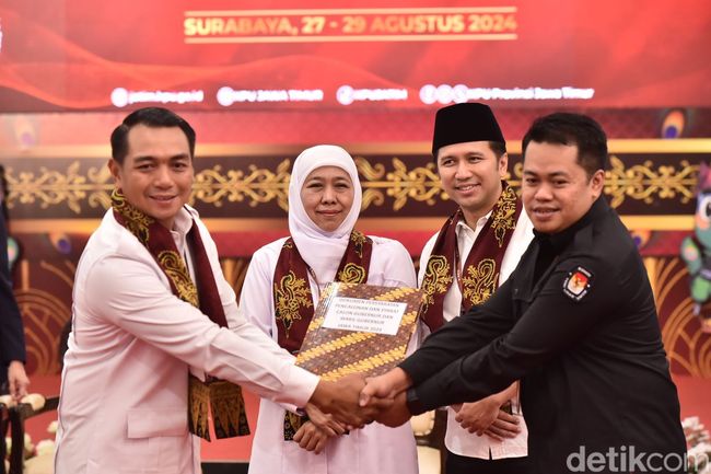 Petahana Khofifah Indar Parawansa-Emil Elestianto Dardak resmi mendaftar ke Kantor KPU Jatim, Rabu (28/8/2024).