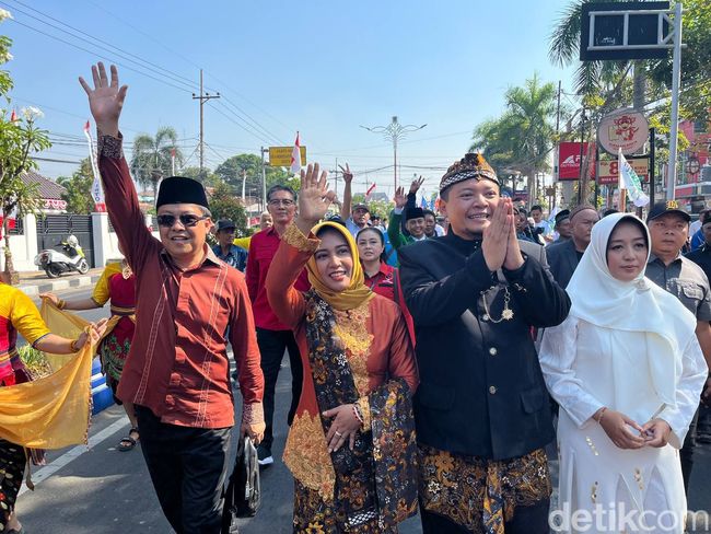 Pasangan Ning Ita-Cak Sandi memilih jalan kaki dari GOR Majapahit di Jalan Gajah Mada ke kantor KPU Kota Mojokerto di Jalan Pahlawan. Keduanya kompak memakai busana tradisional berbalut batik khas Kota Mojokerto.