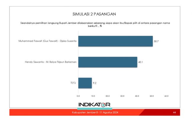 Lembaga survei Indikator Politik Indonesia merilis hasil survei terbaru Pilbup Jember 2024. M Fawait (Gus Fawait)-Djoko Susanto mengungguli petahana Hendy Siswanto-M Balya Firjaun Barlaman.