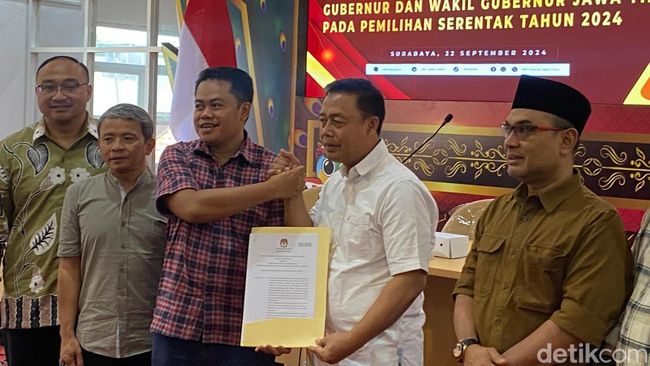 KPU Jatim telah menetapkan 3 paslon peserta Pilgub Jatim 2024. Ketiganya Khofifah Indar Parawansa-Emil Elestianto Dardak, Luluk Nur Hamidah-Lukmanul Khakim, dan Tri Rismaharini-Zahrul Azhar Asumta.