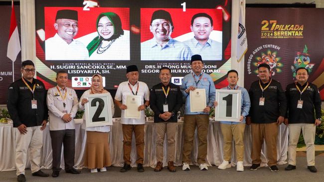 "Sesuai dengan rapat pleno hari ini, nomor urut 1 pasangan Ipong-Luhur dan nomor urut 2 pasangan Sugiri-Lisdyarita," tutur Ketua KPU Ponorogo, R Gaguk Ika Prayitna kepada wartawan, Senin (23/9/2024).