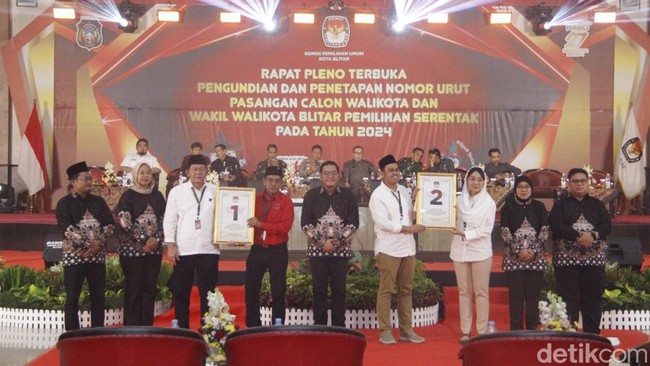 "Pengundian nomor urut ini penting untuk keperluan surat suara, mengkampanyekan paslon dan sebagainya. Sehingga malam ini digelar pengundian nomor urut Paslon Pilwali Kota Blitar," kata Ketua KPU Kota Blitar, Rangga Bisma Aditya kepada awak media, Senin (23/9/2024).