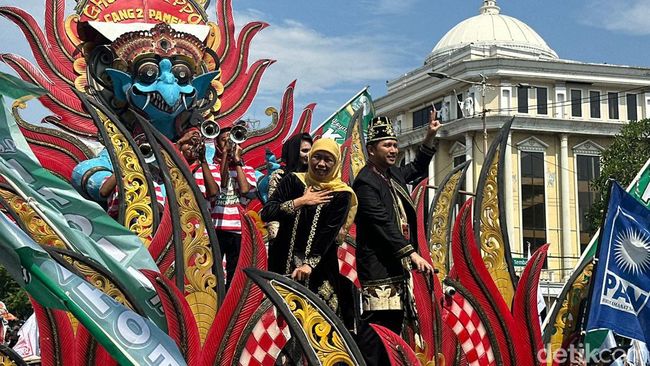 Paslon nomor urut 2 Khofifah Indar Parawansa-Emil Elestianto Dardak diarak ribuan pendukung dan relawannya menuju Tugu Pahlawan Surabaya, Selasa (24/9/2024) siang. Khofifah-Emil menghadiri acara Deklarasi Kampanye Damai yang digelar KPU Jatim.