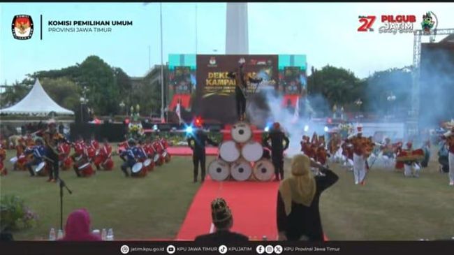 Dalam acara ini, ada momen menarik ketika Calon Gubernur Jawa Timur nomor urut 2 Khofifah Indar Parawansa berdiri tegak membalas hormat yang diberikan Drum Major saat acara Deklarasi Kampanye Damai Pemilihan Gubernur dan Wakil Gubernur Jawa Timur 2024.