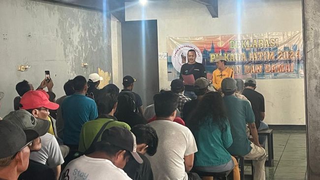 Seratusan warga Surabaya mendeklarasikan dukungan Pilkada Jatim 2024 aman, lancar, dan damai. Mereka berkumpul di Raya Dupak Surabaya.