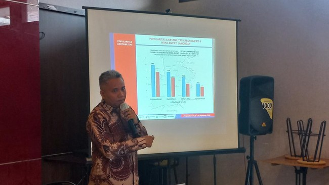 "Dalam temuan survei ini secara elektabilitas pasangan Abdul Ghofur-Firosya 30,5% sedangkan pasangan Yuhronur Effendi-Dirham Akbar 59,3% dan yang belum menentukan pilihan 10,2%. Dari hasil temuan ini masyarakat Lamongan masih 63,6% memungkinkan mengubah pilihan 2 hari sebelum coblosan," kata Denny saat merilis hasil survei di Aula Dapur Kopi Lamongan, Kamis (3/10/2024).