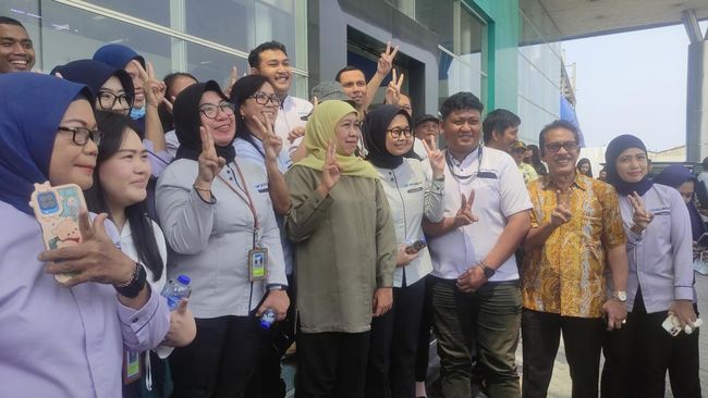 Khofifah rela mendatangi setiap buruh yang sedang menanti kedatangannya. Mereka kemudian ramai-ramai foto bareng dengan mantan Mensos itu. Kedatangan Khofifah di pabrik ini didampingi DPD serikat pekerja Jawa Timur.