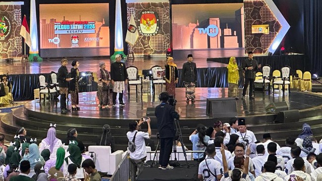 Debat perdana Pilgub Jatim 2024 digelar di Graha Unesa Surabaya, Jumat (18/10/2024). Tema besar yang diangkat 'Transformasi Sosial dan Peningkatan Produktifitas Sumber Daya Lokal untuk Kesejahteraan Masyarakat Jawa Timur'.