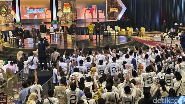 Debat perdana Pilgub Jatim 2024 digelar di Graha Unesa Surabaya, Jumat (18/10/2024). Tema besar yang diangkat 'Transformasi Sosial dan Peningkatan Produktifitas Sumber Daya Lokal untuk Kesejahteraan Masyarakat Jawa Timur'.