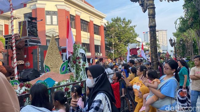 Pantauan detikJatim di Jalan Tunjungan, Surabaya, puluhan warga berjajar di balik barikade yang dipasang. Mereka menyaksikan maskot yang diarak.