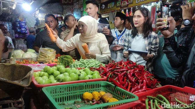 Begitu masuk ke pasar, Khofifah mendatangi dan menyapa sejumlah pedagang. Selanjutnya Khofifah keliling ke hampir semua stan mulai dari yang menjual kebutuhan sehari-hari, kue, sayuran, hingga daging.