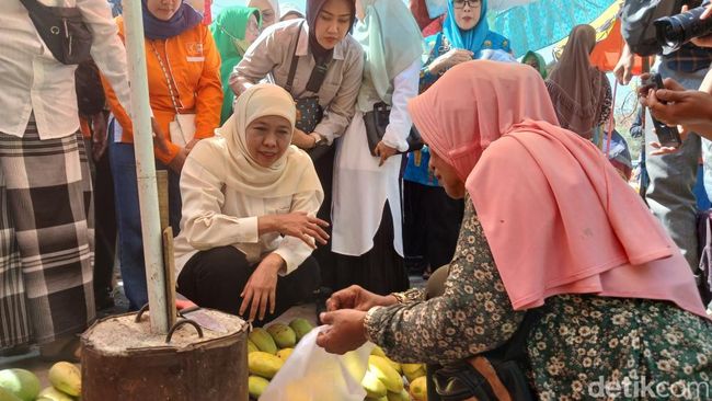 Khofifah lantas mendatangi para pedagang mangga di sisi luar. Ia memborong mangga. Ia juga berbincang dengan pedagang.
