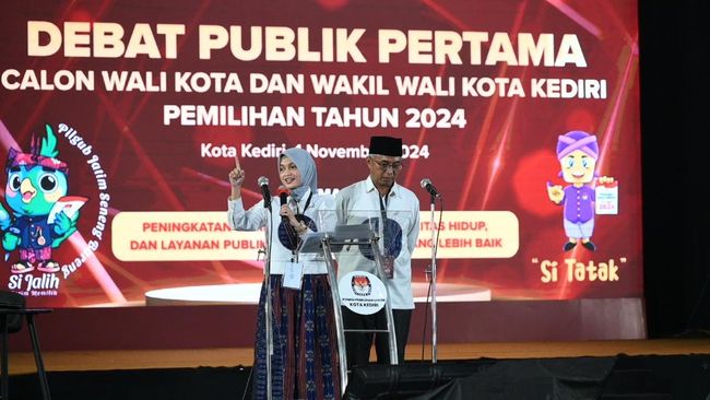 Calon Wali Kota Kediri nomor urut 01 Vinanda Prameswati menyoroti tingkat kemiskinan saat debat perdana, Jumat (1/11). Ia mengungkapkan kemiskinan di Kota Kediri menduduki tertinggi kedua di Jatim.