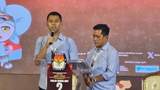Cawali Kota Batu nomor urut 2 Firhando Gumelar memaparkan program Mobil Guru BK saat sesi debat publik kedua Pilkada Kota Batu 2024 di Singhasari Hotel and Resort Kota Batu, Jumat (8/11/2024) malam.