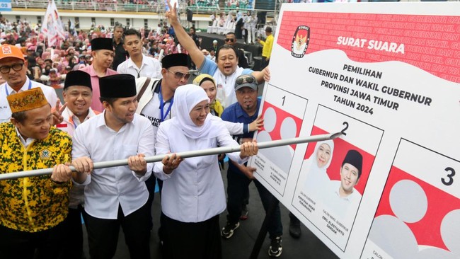 Paslon Gubernur-Wakil Gubernur Jawa Timur nomor urut 2, Khofifah Indar Parawansa-Emil Elestianto Dardak menggelar kampanye akbar di Jember Sport Garden, Minggu (10/11/2024).