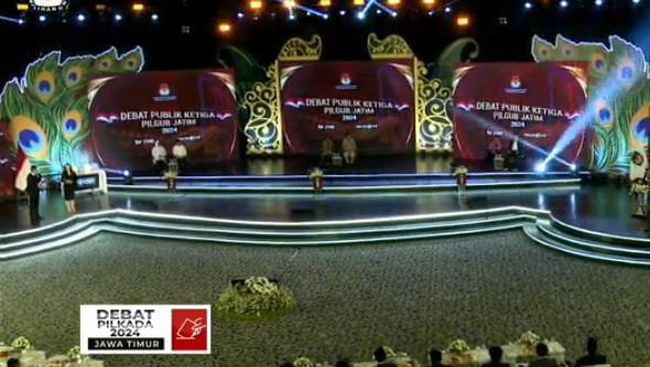 Debat ketiga Pilgub Jatim 2024 mengangkat tema 'Akselerasi Pembangunan Infrastruktur, Interkoneksitas Kewilayahan dan Peningkatan Kualitas Lingkungan Hidup untuk Mewujudkan Jawa Timur sebagai Episentrum Ekonomi Kawasan Timur Indonesia'.