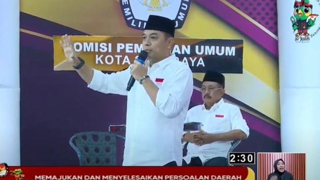 Debat kedua Pilwali Surabaya 2024 masih berlangsung. Calon Wali Kota Surabaya Eri Cahyadi menyinggung tentang rencana keberadaan transportasi LRT dan pelabuhan internasional di Surabaya sebagai bagian untuk mewujudkan Kota Surabaya berkelas dunia.