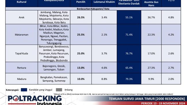 "Khofifah-Emil unggul di segmen sosio wilayah Arek di Jawa Timur," kata Peneliti Utama Poltracking Indonesia Masduri Amrawi dalam keterangannya, Sabtu (23/11/2024).