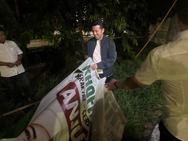 Emil Elestianto Dardak turun langsung guna ikut merapikan baliho kampanye di masa tenang, Minggu (24/11/2024) dinihari.