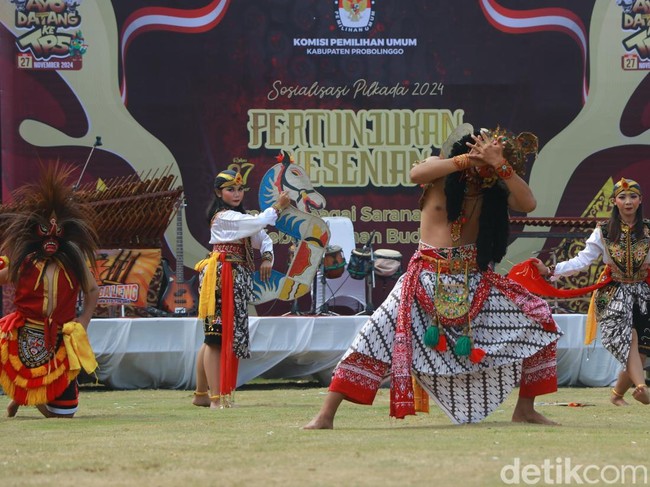 KPU Kabupaten Probolinggo menggelar sosialisasi Pilkada 2024 melalui pertunjukan kesenian. Pertunjukan itu bertema pilkada sebagai Sarana Integrasi Keberagaman dan Budaya pada Minggu (24/11/2024) di Alun-Alun Kota Kraksaan.