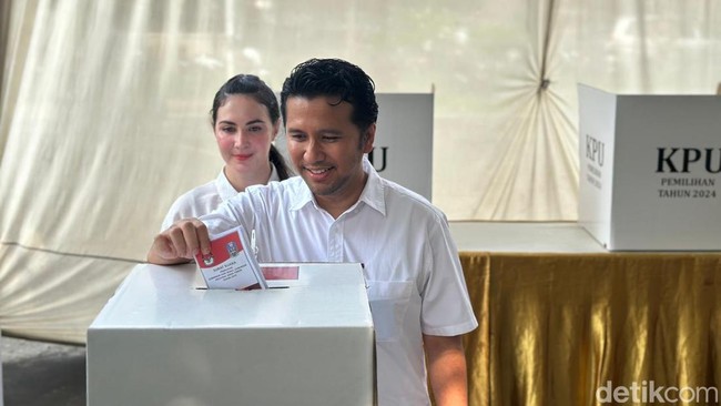 Pantauan detikJatim, Emil Dardak berangkat ke TPS sekitar pukul 08.00 WIB. Emil didampingi istrinya Arumi Bachsin yang juga turut menyalurkan hak suara di TPS 015.