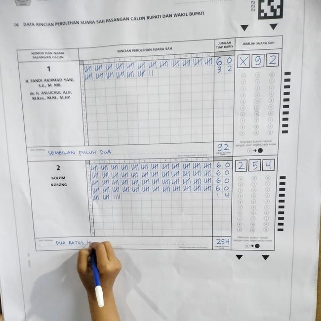 Di TPS 02, Watuagung, Bungah, ada selisih 147 suara yakni Yani Alif mendapat 83 suara sedangkan kotak kosong mendapatkan 230 suara.