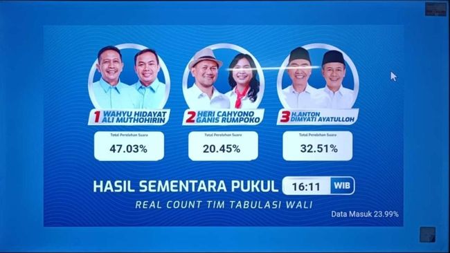 Sementara hasil hitung cepat Indikator menyebutkan pasangan nomor urut 1 Wahyu Hidayat-Ali Muthohirin unggul 47,48 persen, dengan jumlah data masuk sebanyak 55 persen sampai pukul 16.58 WIB.