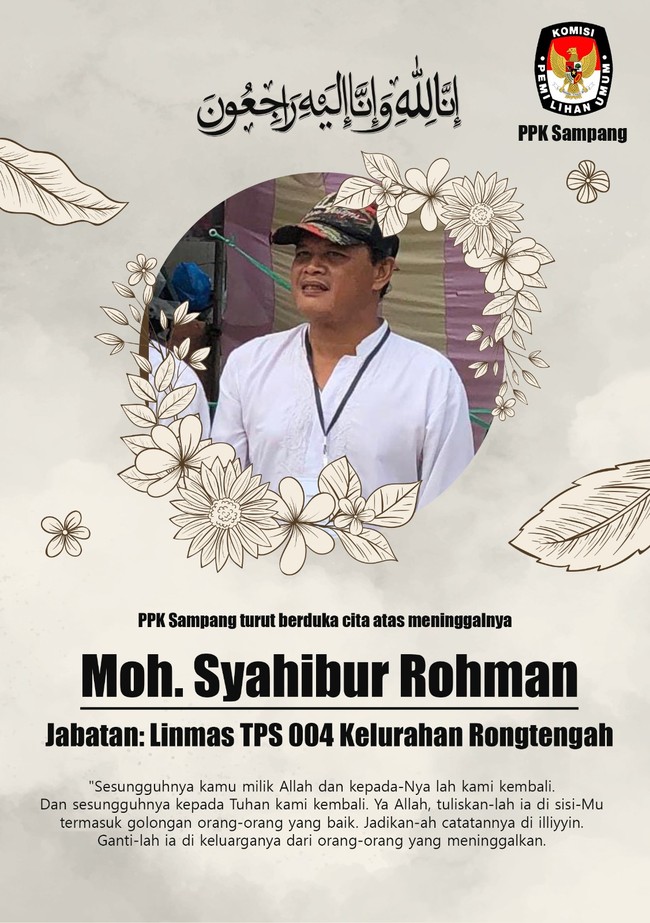 KPU Sampang berduka. Seorang anggota linmas yang bertugas di TPS 4 Kelurahan Rongtengah, Kecamatan Kota Sampang, meninggal dunia. Korban bernama Mohammad Sahibur Rohman, sempat mengeluhkan pusing sebelum akhirnya pingsan dan meninggal.