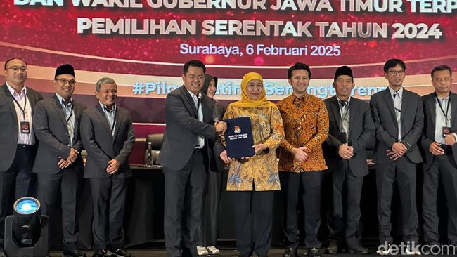 "Hasil Rapat Pleno KPU Jawa Timur menetapkan paslon nomor urut 2, Khofifah Indar Parawansa-Emil Elestianto Dardak sebagai pemenang Pilgub Jatim 2024," kata Ketua KPU Jatim Aang Kunaefi di Hotel Double Tree Surabaya, Kamis (6/2/2025)