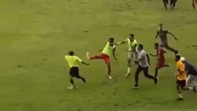 Sebuah pendek berdurasi 1 menit yang menyebar luas di media sosial memperlihatkan puluhan orang mulai pemain hingga ofisial tim berlarian mengejar wasit pertandingan.
