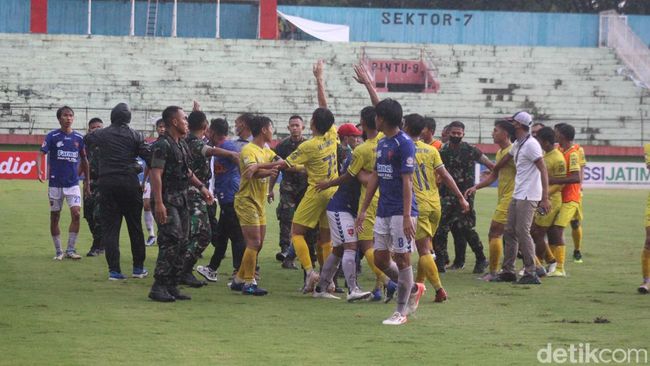 Setelah terhenti 10 menit, pantauan detikJatim, panpel mengajak berunding kedua kesebelasan dan pertandingan dilanjutkan kembali.