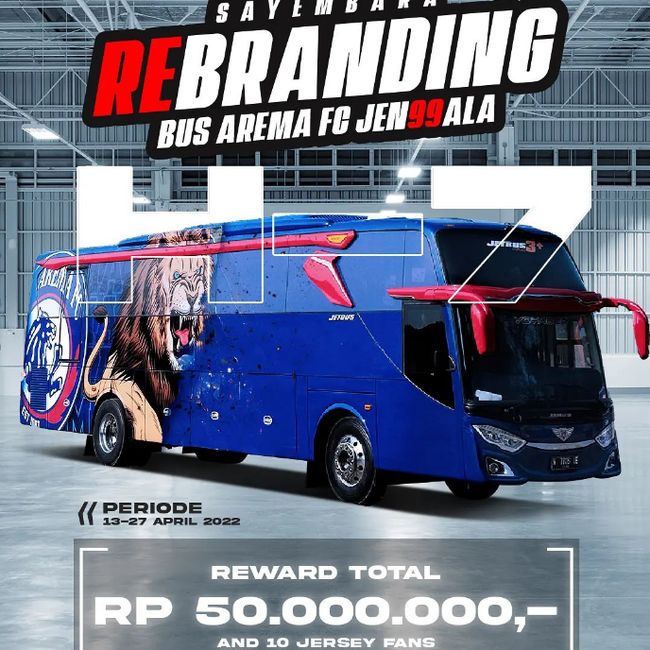 "Sebagai bentuk apresiasi atas tingginya animo peserta sayembara #rebrandingbusaremafc Presiden Arema FC @juragan_99 menambah total hadiah menjadi 50 Juta Rupiah. Jangan lewatkan kesempatan ini, tampilkan karya terbaik umak!" tulis akun Instagram @aremafcofficial seperti yang dilihat detikJatim, Jumat (22/4/2022).