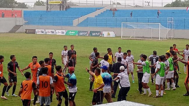 Pertandingan sepakbola Porprov Jatim antara Jember vs Kota Malang diwarnai kericuhan. Para pemain kedua kesebelasan saling adu jotos di lapangan.