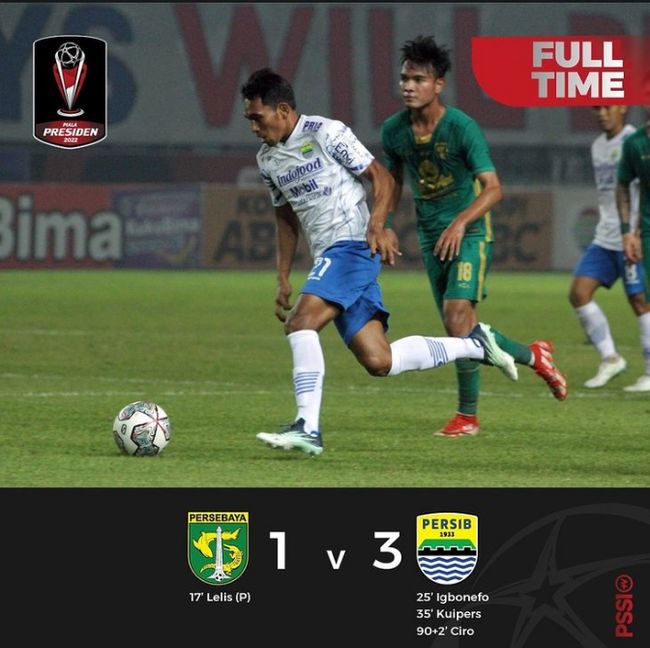 Persebaya kalah 1-3 oleh Persib Bandung di babak penyisihan Grup C Piala Presiden 2022. Laga berlangsung pada Jumat (17/6/2022) pukul 20.30 WIB di Stadion GBLA, Bandung.