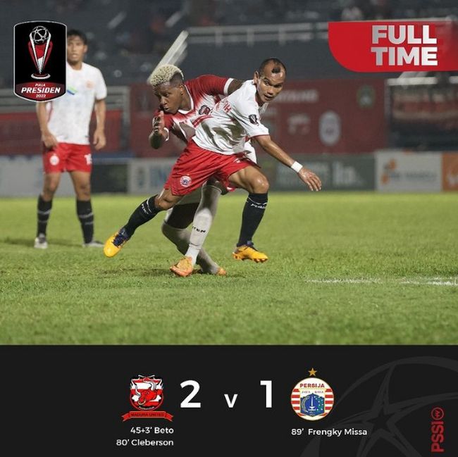 Laga Madura United vs Persija Jakarta digelar pada Selasa (28/6/2022) pukul 20.30 WIB, di Stadion Segiri Samarinda. Laga berakhir dengan skor 2-1 untuk MU.
