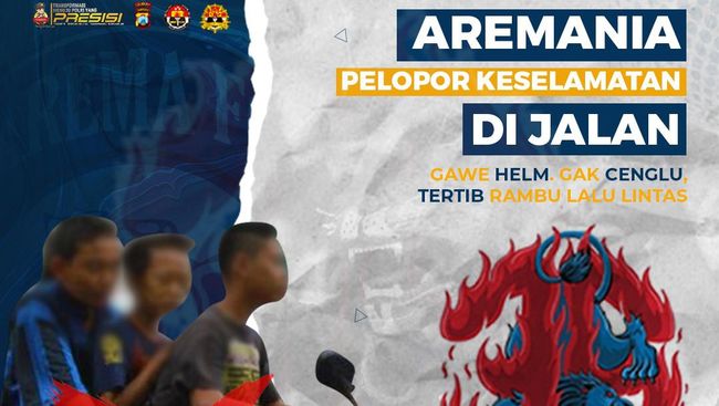 "Aremania pelopor keselamatan di jalan, gawe helm, gak cenglu (gonceng telu) tertib rambu lalu lintas," bunyi pesan digaungkan Polres Malang.