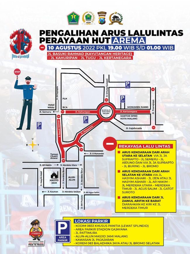 "Penutupan diberlakukan mulai pukul 19.00 WIB sampai dengan pukul 01.00 WIB. Karena peringatan HUT ke-35 Arema FC dipusatkan di kawasan Kayutangan Heritage," ujar Kasatlantas Polresta Malang Kota Kompol Yoppi Anggi Khrisna kepada wartawan, Selasa (9/8/2022).