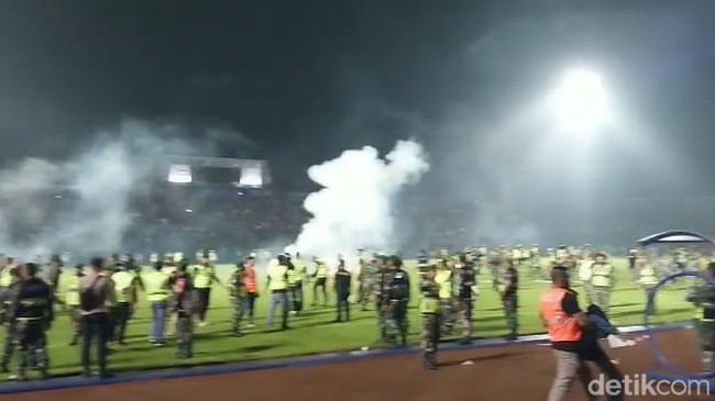Karena kewalahan, aparat kemudian mulai melepaskan tembakan gas air mata ke arah suporter agar bubar dan kembali ke tribun.