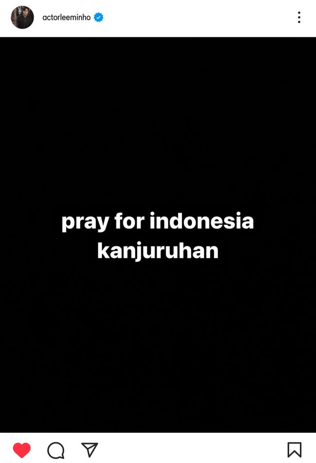 "Pray for Indonesia Kanjuruhan," tulis Lee Min Ho pada akun Instagram pribadinya yang dilihat detikJatim, Minggu (2/10/2022).