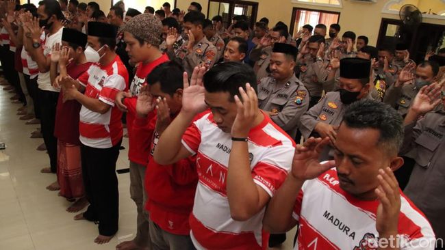Suporter Madura United K-conk Mania bersama anggota Polres Bangkalan menggelar salat gaib. Kegiatan ini ditujukan untuk korban Tragedi Kanjuruhan, Sabtu (1/10).