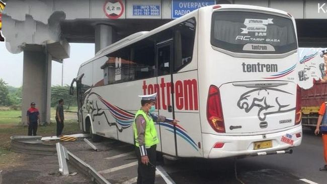 Anggota PJR Tol Jatim II Briptu Budiman mengatakan kecelakaan terjadi pada sekitar pukul 07.55 WIB. Bus yang menabrak tiang itu dikemudikan Anton Junaedi (42) warga Singosari, Malang.