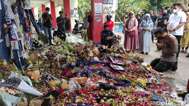 Pantauan detikJatim, Putu nampak duduk bersimpuh sembari memanjatkan doa untuk para korban Tragedi Kanjuruhan saat berada di depan Pintu 13. Ikut mendampingi Kasat Reskrim Polres Malang AKP Donny Kristian Bara'langi dan jajaran di lingkungan Satreskrim Polres Malang.