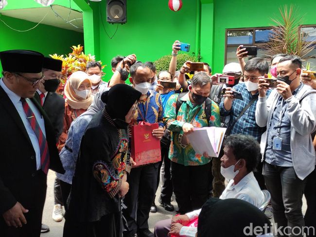 Menteri Sosial RI Tri Rismaharini secara langsung memberikan bantuan dari Presiden Joko Widodo kepada ahli waris korban meninggal Tragedi Kanjuruhan di halaman Kantor Kecamatan Lowokwaru, Kota Malang, Jumat (28/10/2022).