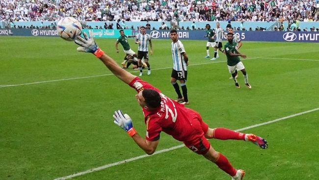 Al Owais menyelamatkan Arab Saudi. Ia bisa menangkap sundulan Julian Alvarez di depan gawang menjelang akhir laga.